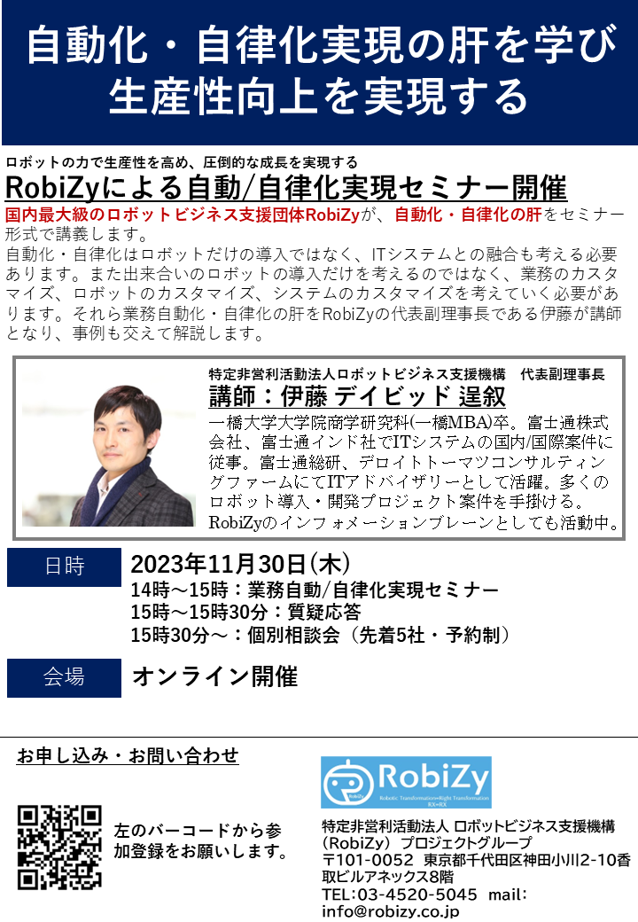 2023年11月30日(木) RobiZy主催セミナー「自動化・自律化実現の肝を学び生産性向上を実現する」開催